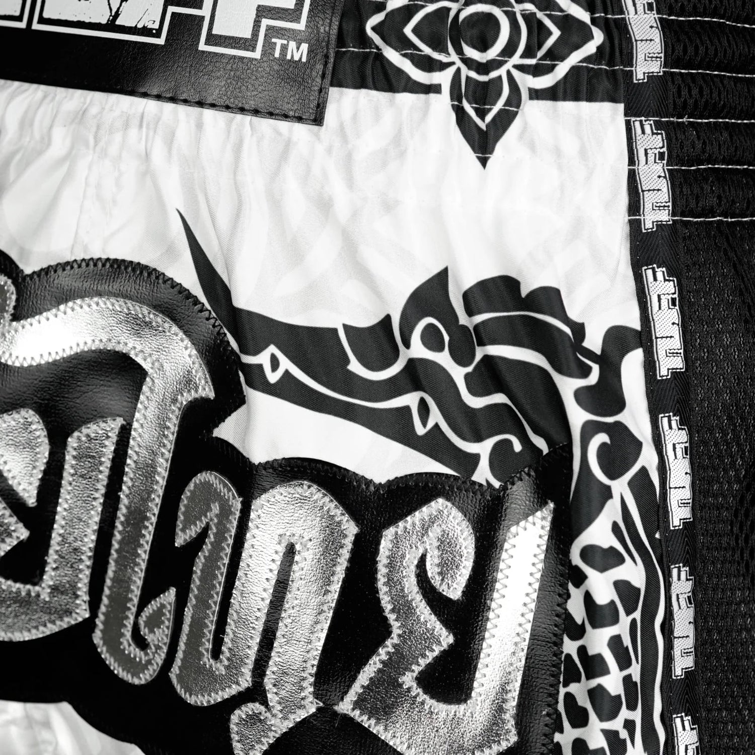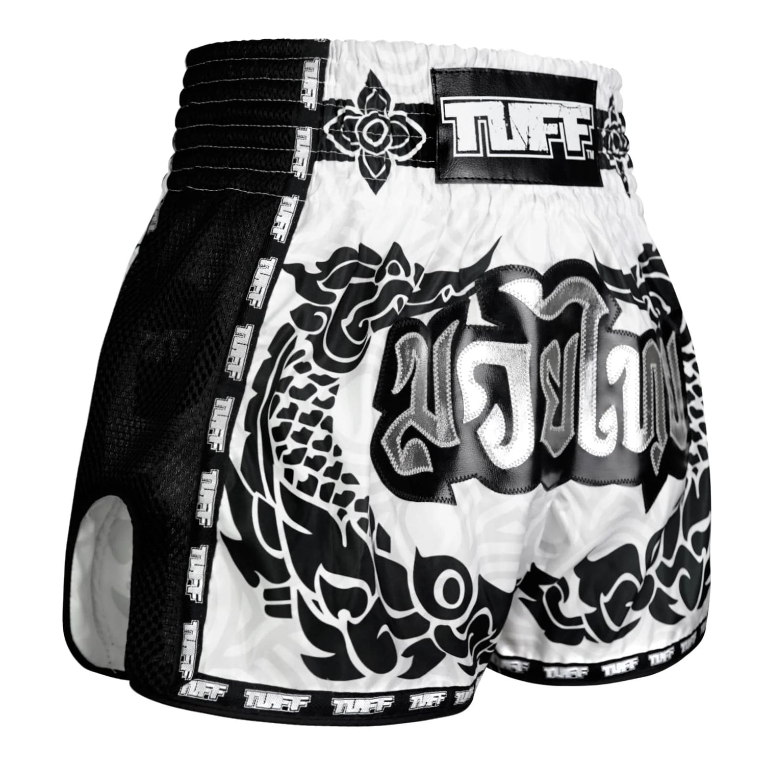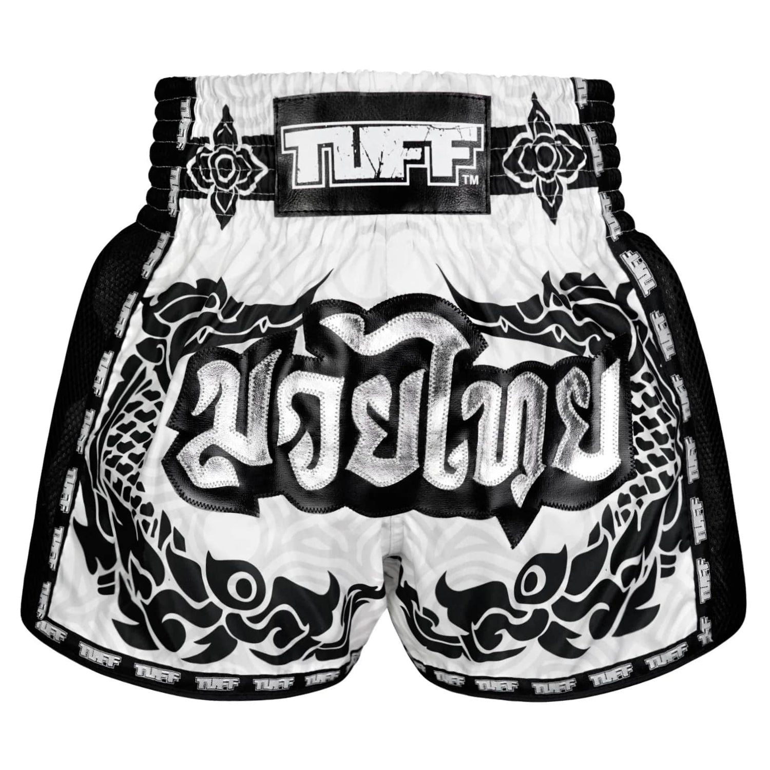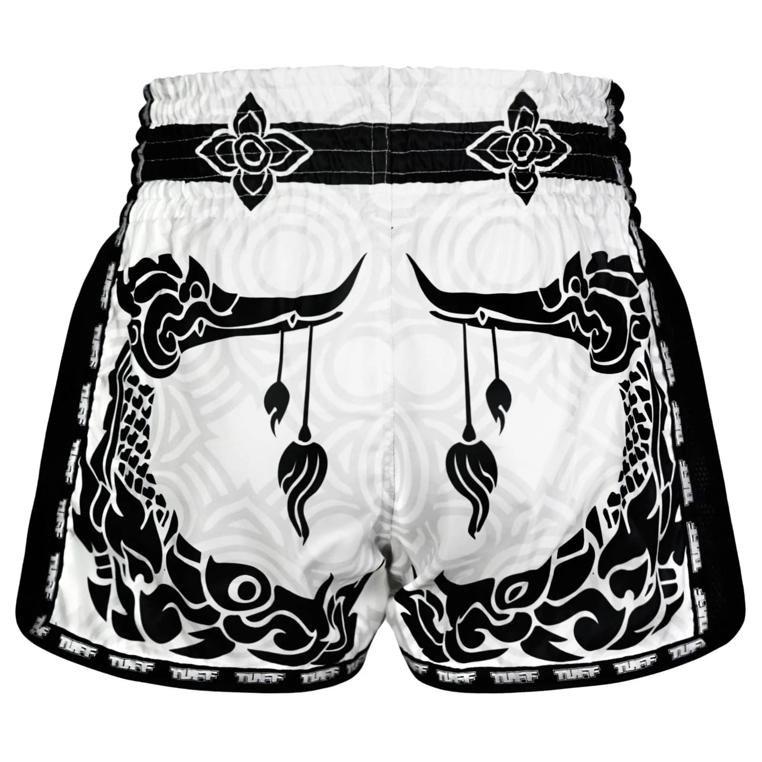 The white boxing shorts feature a black Thai traditional pattern which is influenced by the graceful Hongsa and the guardian of the treasure, Naga.
